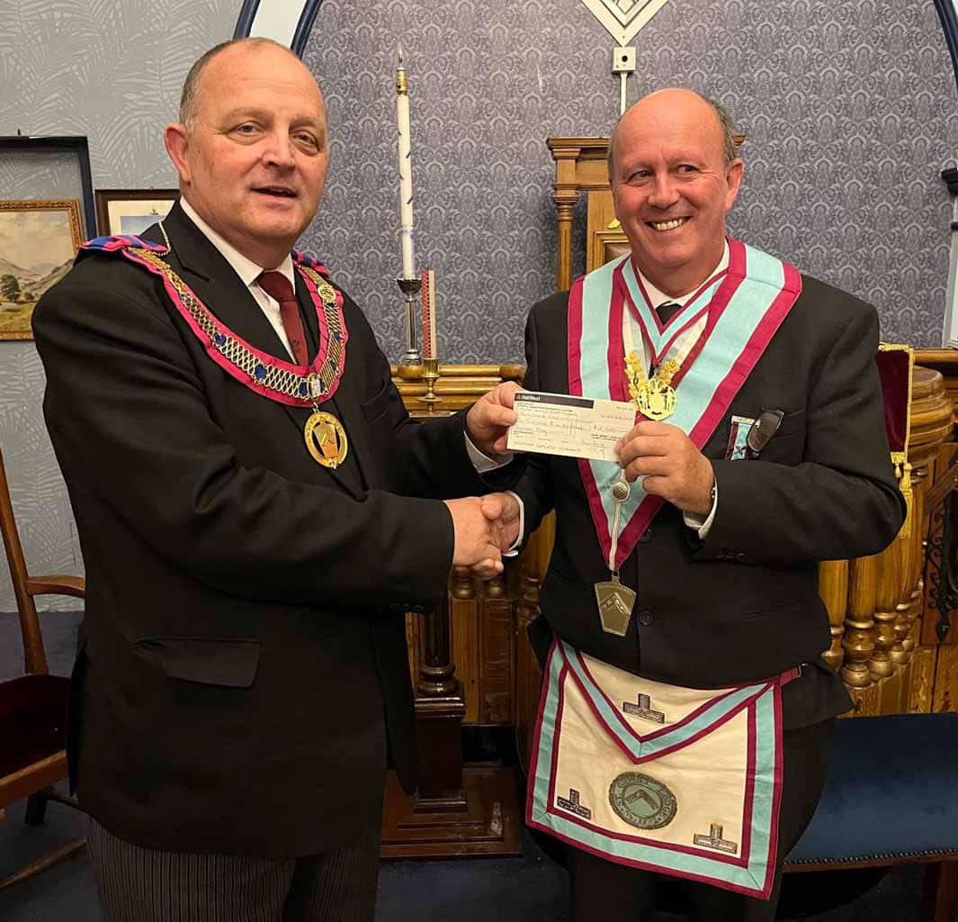 At the Installation meeting of St Grwst Mark Lodge No. 1772, the new Master W.Bro. John Smart presented the Deputy Provincial Grand Master W Bro. Colin A Lemin with a cheque for £2,500 for the N.Wales Mark Benevolent Fund, a tremendous achievement from this small Lodge based in Llanfairfechan.